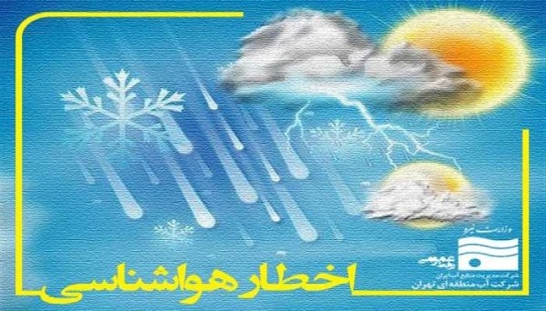 به گزارش روابط عمومی شرکت آب منطقه ای، براساس هشدار سطح زرد سازمان هواشناسی ، مبنـی بر نفوذ و فعالیت سامانه بارشی ، طی روز چهارشنبه (20 دی ماه) لغایت جمعه (22 دی ماه) در استان تهران و البرز ، بارش باران، در نواحی سردسیر و مرتفع بارش برف، وزش باد شدید موقت، در نواحی کوهستانی کولاک برف و کاهش نسبی دما پیش بینی گردیده است که احتمال آبگرفتگی معابر، وجود خواهد داشت.