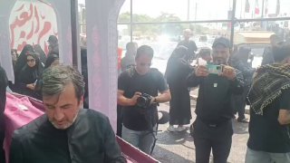 حضور بیژن سلیمان پور معاون استاندار تهران و فرماندار ویژه شهرستان ری در محل موکب خدمات رسانی شهرداری کهریزک و پذیرایی از زائرین و شرکت کنندگان در مراسم راهپیمایی عظیم جاماندگان اربعین حسینی «ع» در ضلع جنوبی آستان مطهر حضرت عبدالعظیم الحسنی «ع»